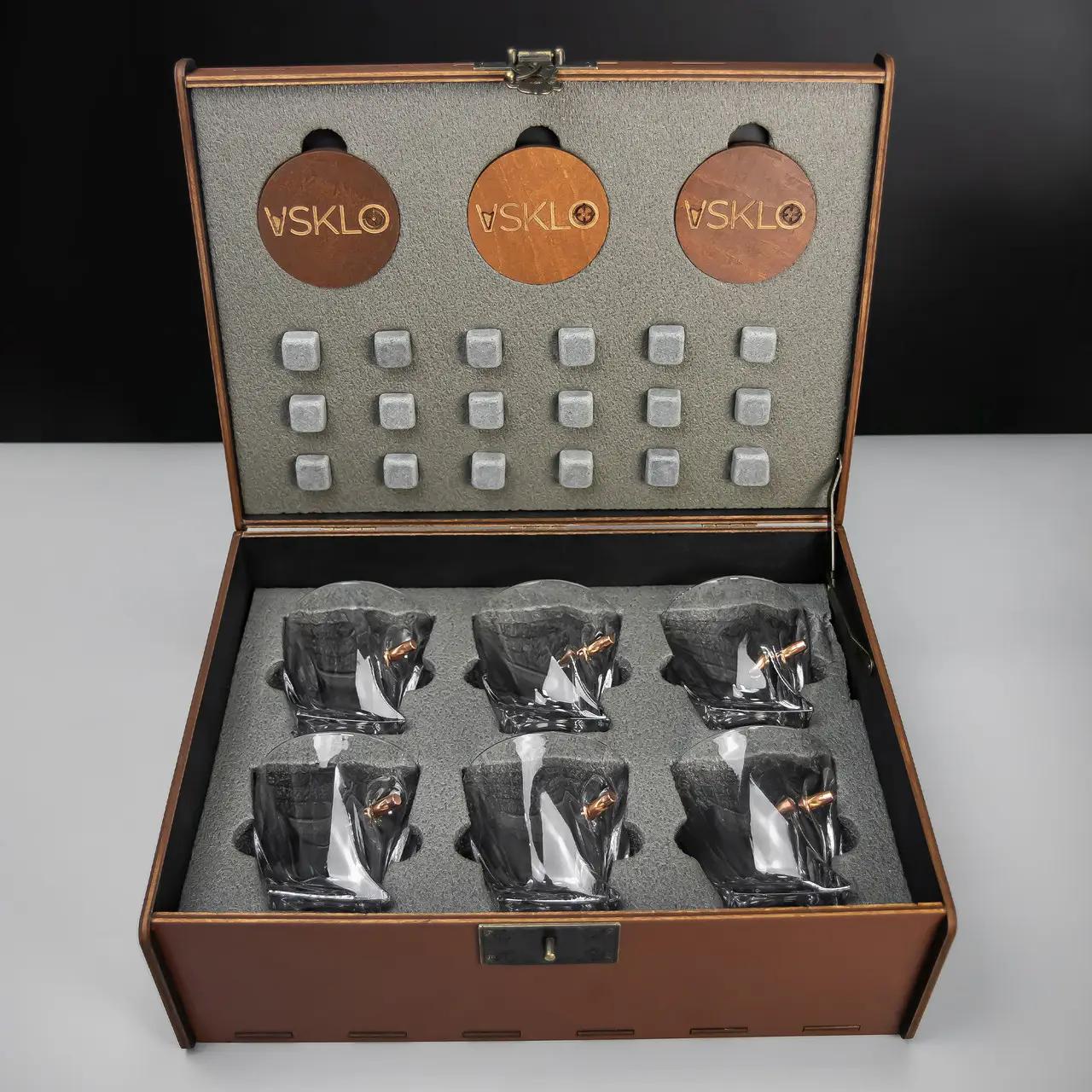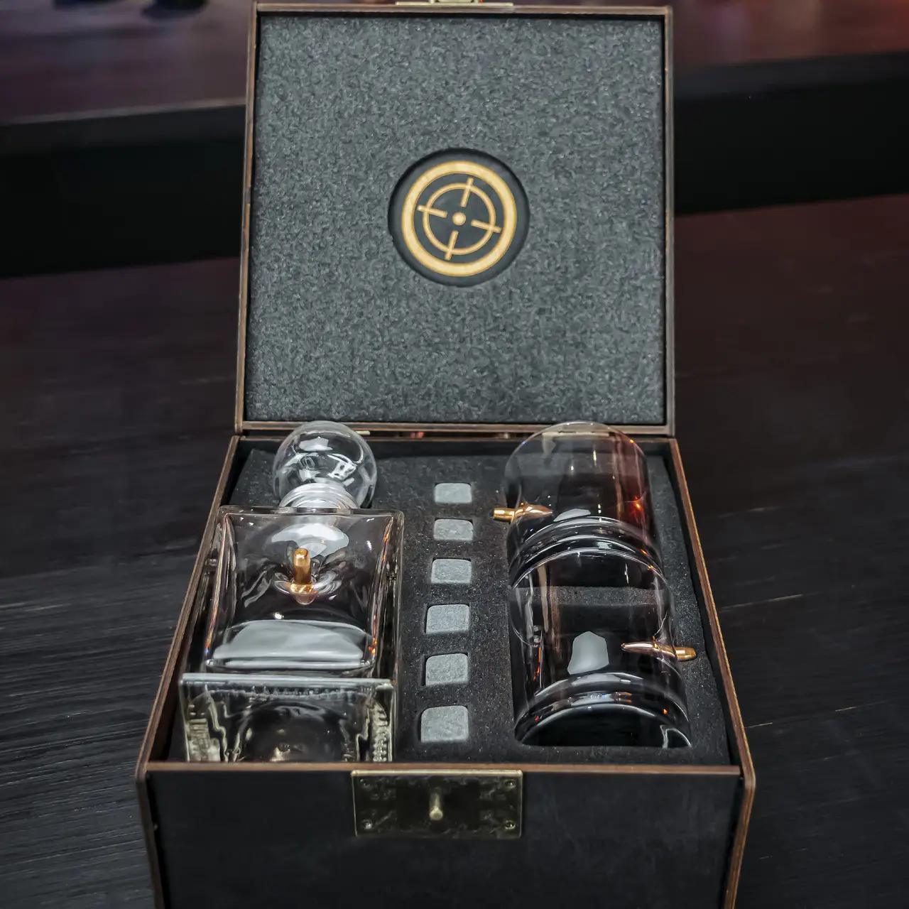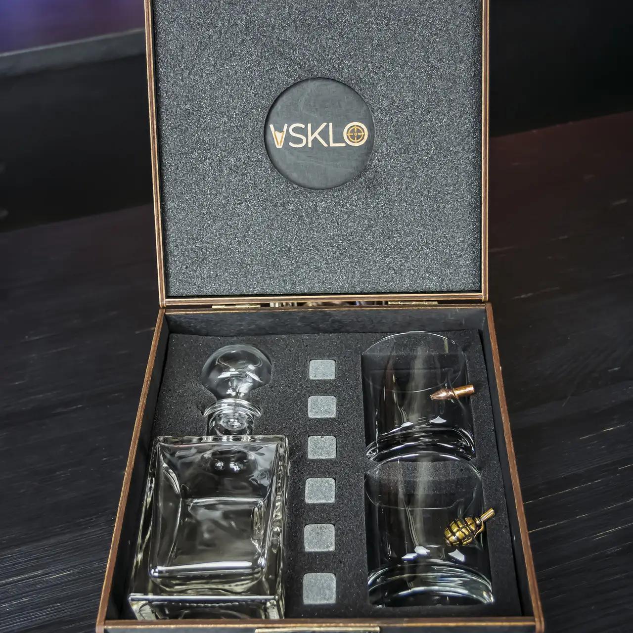 - Подарункові набори — містять склянки, графини, охолоджувальне каміння, підставки та навіть ексклюзивну дерев’яну коробку.